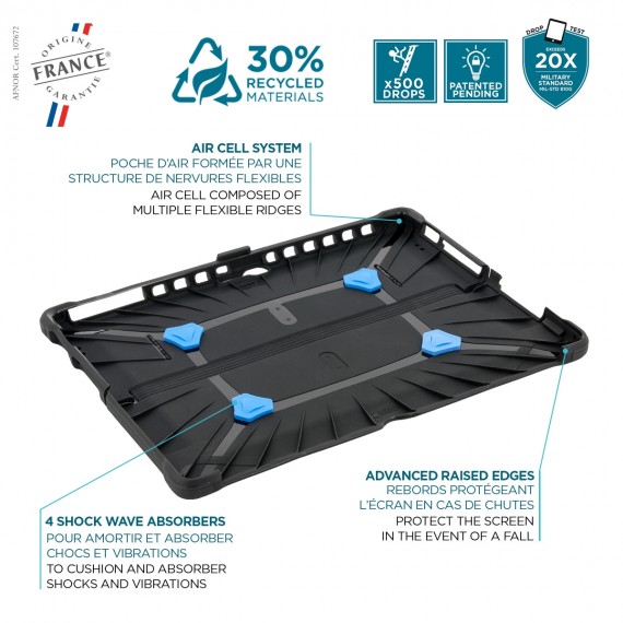 They have been designed in France to protect your devices efficiently against shocks, vibrations and breakage! A very high level of resistance to falls: 20 times higher than the requirements of the military standard MIL-STD 810G. More than 500 falls from 1.2m height on a concrete floor!