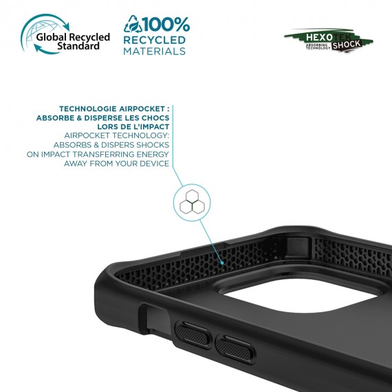 In addition, the built-in antimicrobial technology of this shell protects your iPhone 15 - iPhone 14 by reducing the bacteria by up to 99.99%, for a healthier surface. In short, this ultra protective case offers you a double barrier of protection while keeping a very slim design, made from 100% recycled materialsand 100% dedicated to your device!