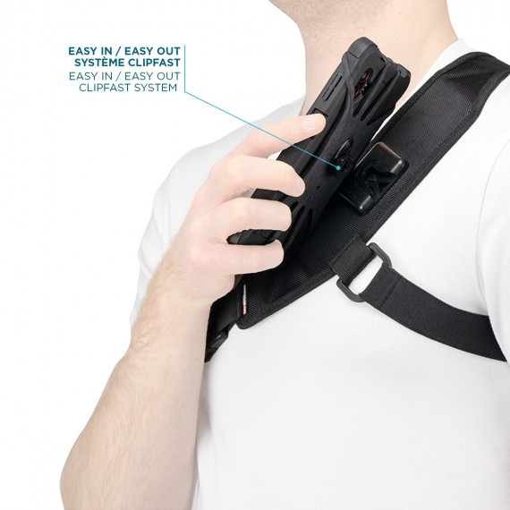 - Easy in / Easy out : quickly install & remove the device from the shoulder strap