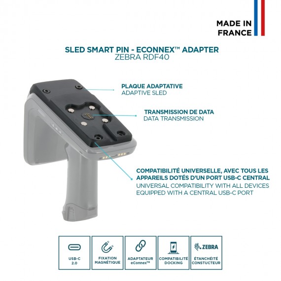 Thanks to its eConnex™-compatible Pogo Pin connection system, this adapter converts data to create seamless communication between your smartphone's USB interface and the Zebra RDF40's eConnex™ interface. It is ideal for mobile environments or applications requiring a high degree of freedom of movement (inventory, stock management, logistics, etc.).