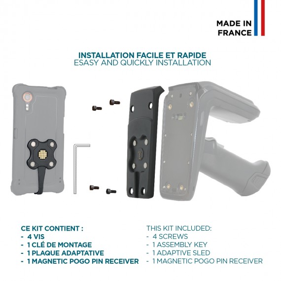 The solution combining an adaptive plate and an ENERGIA MOBILE dongle allows you to magnetically connect a smartphone to a Zebra RFD40 UHF RFID reader for simple, fast and wireless use.