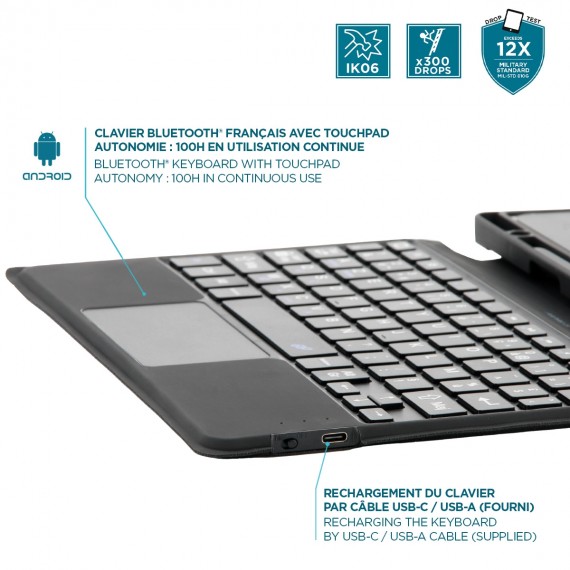 The useful tripod located behind the screen ensures the support of your tablet when using the touch screen. When transporting your tablet, the case closes thanks to a magnetic tab that protects the screen and keeps the keyboard closed.