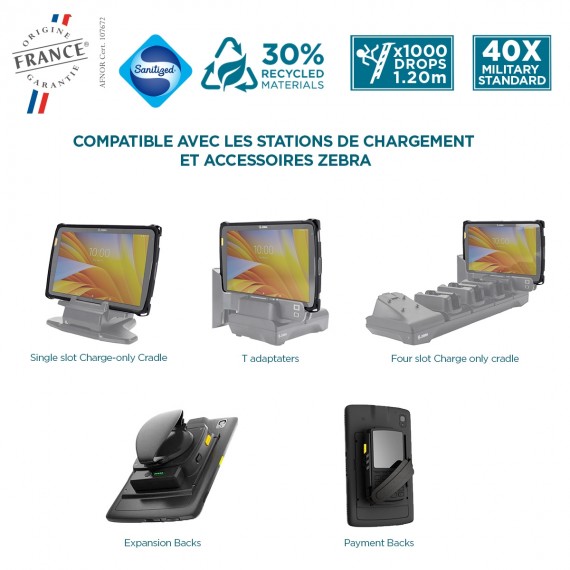 - Compatible with charging stations (Single Slot Charge-only Cradle/T adapters/Four slot Charge only cradle). Accessible battery cover to accommodate Zebra mounts on the back (Expansion Backs/Payment Backs)