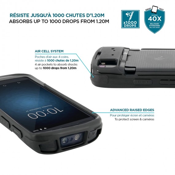Zebra's TC53 and TC58 rugged case is made in France from high quality, impact resistant materials. The combination of these materials provides complete protection for your Zebra TC53 and TC58 while ensuring a comfortable and convenient grip for efficient work.
