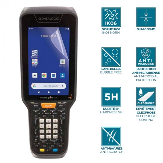 Discover the MOBILIS®-designed tablet Clear screen protector; it effectively protects the screen of your Datalogic Skorpio X5 against breakages, scratches, dust, etc. This screen protector is IK06 standard, has the best shockproof protection on the market, and its Clear finish retains 99% of the screen’s sharpness. It’s an easy to install, versatile and shatterproof screen protector. Thanks to its anti-bubble technology, installing your screen protector is no longer a problem. The product is also supplied with a cleaning kit, a microfibre cloth and a smoothing card to make installation as easy as possible. It also has perfect touch sensitivity. With its Clear protection, your terminal’s screen will be fully protected.