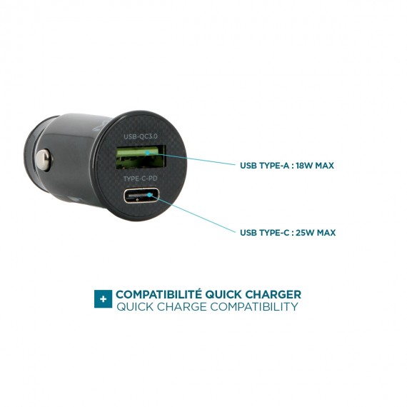 Ce chargeur vous permet de recharger la batterie de votre smartphone ou de votre tablette lorsque vous conduisez. Avec son format compact, il est muni d'un port USB C et d'un port USB A, il se branche directement à la prise allume-cigare de votre véhicule. Ainsi, vous n'avez plus à vous soucier des problèmes de batterie lorsque vous êtes en déplacement. Ce chargeur de voiture MOBILIS® deviendra votre meilleur allié.